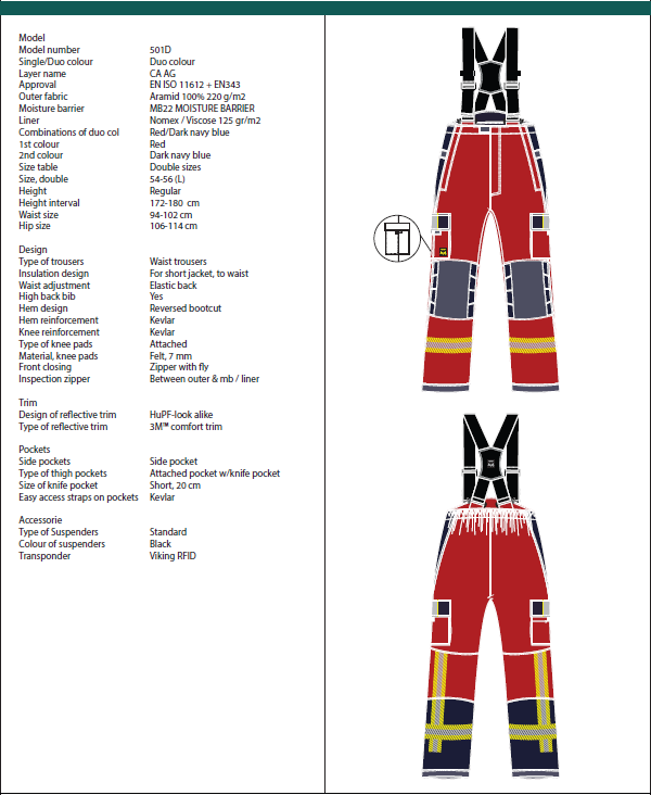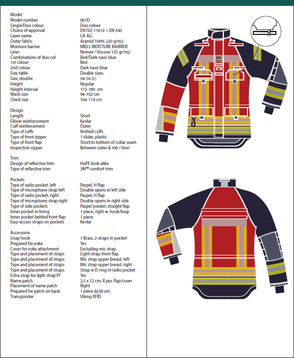 현장 대원들의 작업 내용의 최대 90%까지는 사실상, 강력한 화재 및 폭발 등으로부터의 보호를 요구하지는 않습니다. 대신, 신속하고 자유로운 움직임을 보장하고 충분한 보호를 받을 수 있도록, 오랜시간 동안 구조 및 현장 작업에 전념할 수 있는 보호복(구조복)이 필요합니다. 바이킹 춘추용 기술구조활동복 TH 모델은 EN469:2020 Level 1 방화복 인증 성능을 기준하고 있습니다.