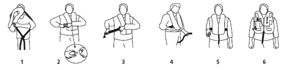 1. 왼팔을 구명의 착용줄 사이로 넣고 구명의를 머리쪽으로 착용합니다.