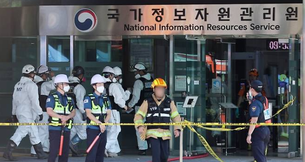지난 27일 오전 대전 유성구 국가정보자원관리원 화재현장에서 경찰 과학수사대 화재감식 관계자들이 건물 내부로 이동하고 있다. 전산 자원을 통합 관리하는 행정안전부 산하 국가정보자원관