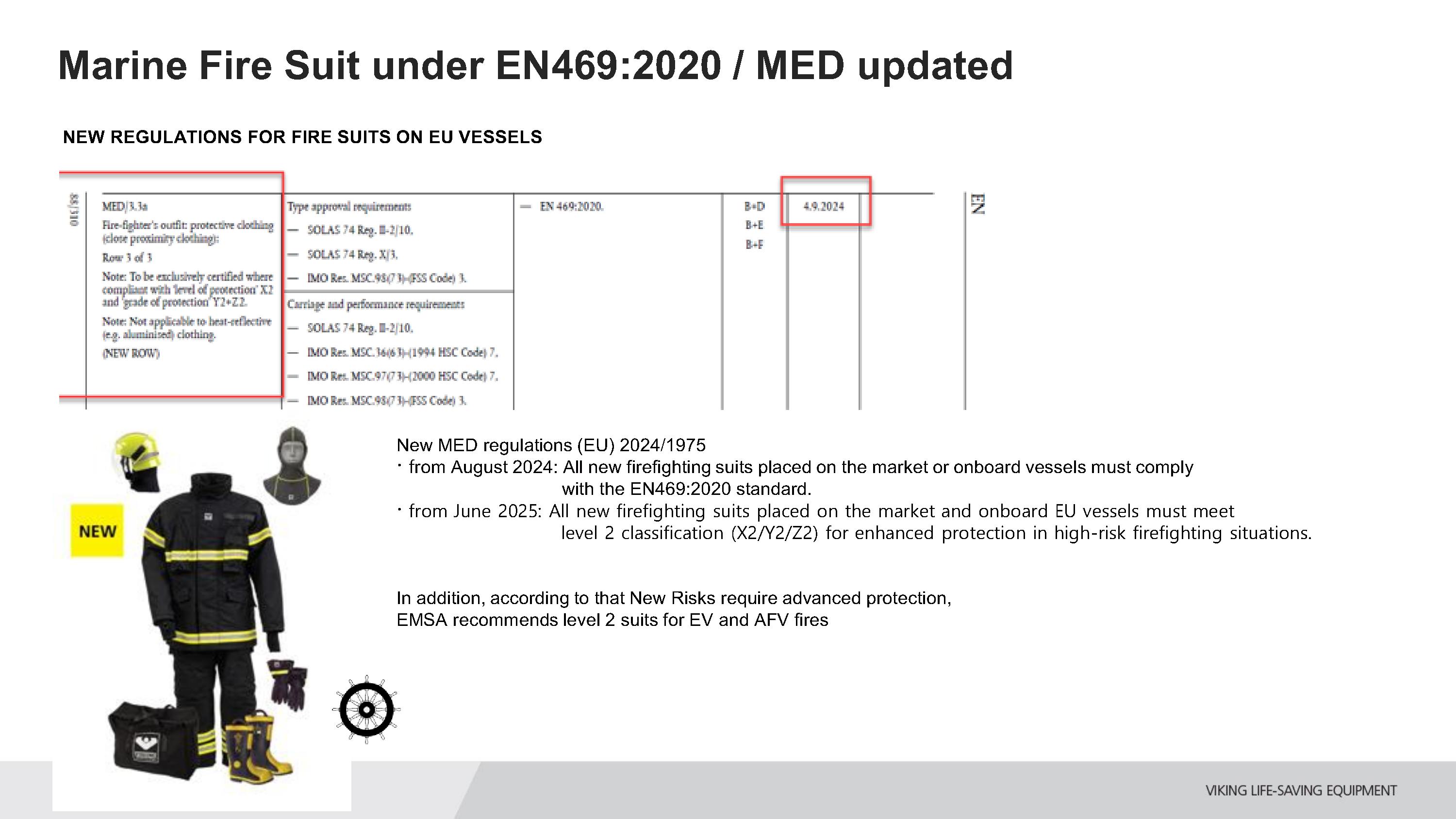 본건은 Fireman’s Outfit에 적용되는 해상용 방화복 구성에 관련된 사항으로, 신규 EN469:2020 규정과 SOLAS MED 강제 적용 규정으로, 2025년 6월 이후로는 신규 SOLAS MED 강제 규정에 의거하여 기존(옛날) 모델은 강제적으로 사용/적용이 중단되었습니다.