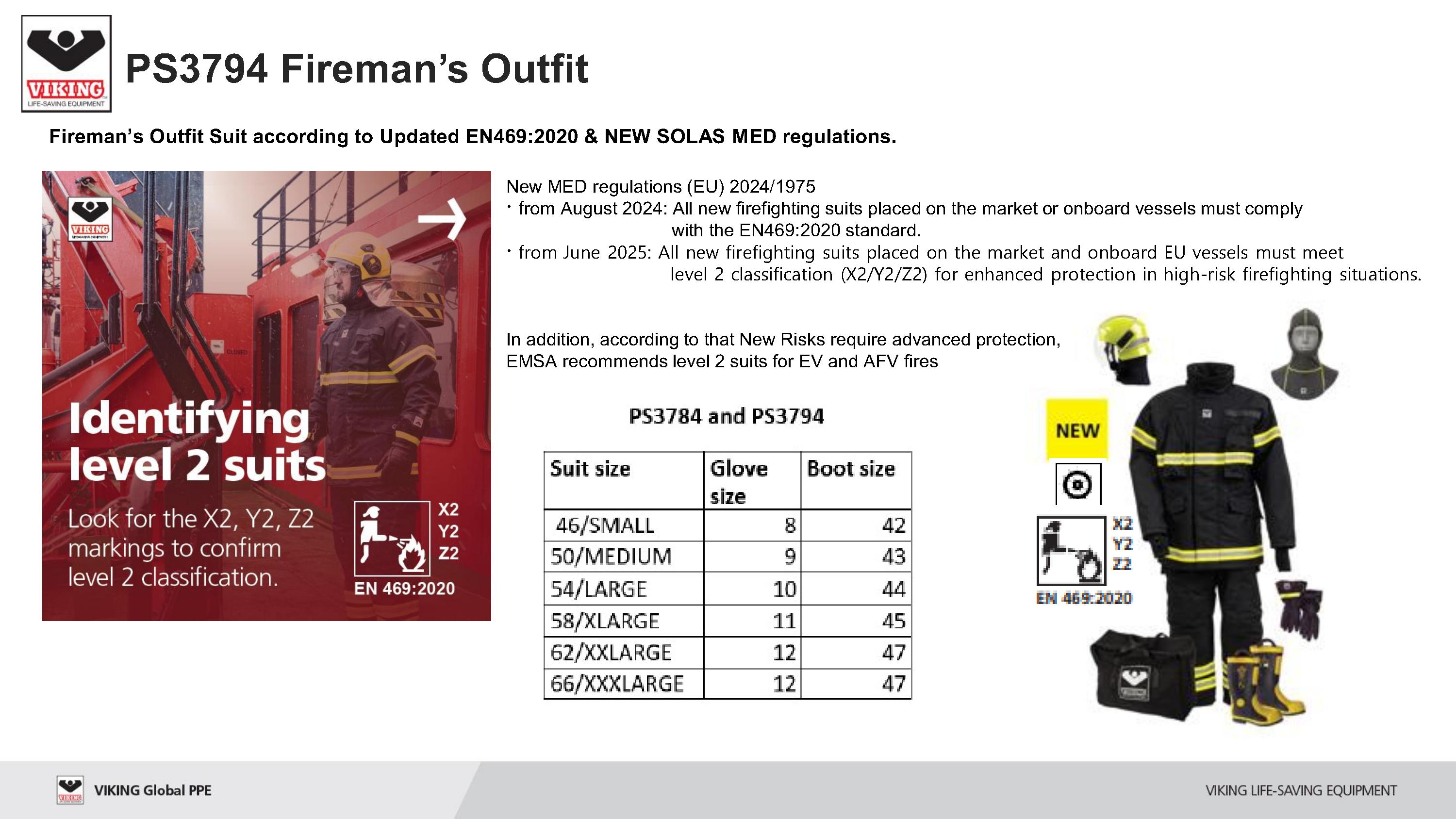 현재, 전세계 시장에서 가장 합리적으로 운영/공급/적용되는 모델로 (Fire suit + Fire helmet + Fire gloves + Fire Boots + Fire hood in a bag), VIKING 모델을 따라오기 위한 중국 모델은 세탁 횟수가 제한되고 EC type approval이 없는 SOLAS 인증으로, 사용/적용상 문제 및 공급 이후에 심각한 문제에 직면할 수 있는 오류가 있습니다.