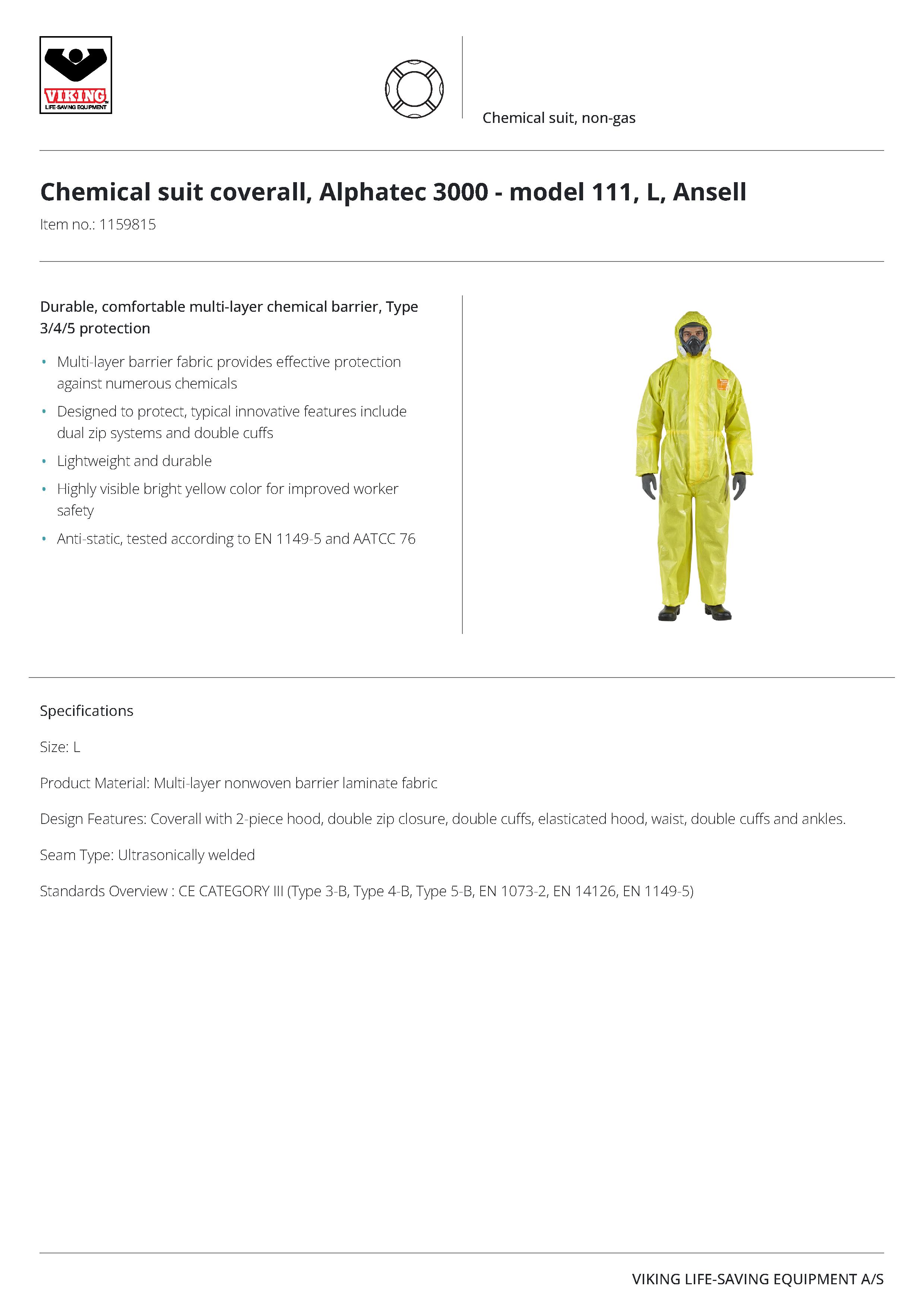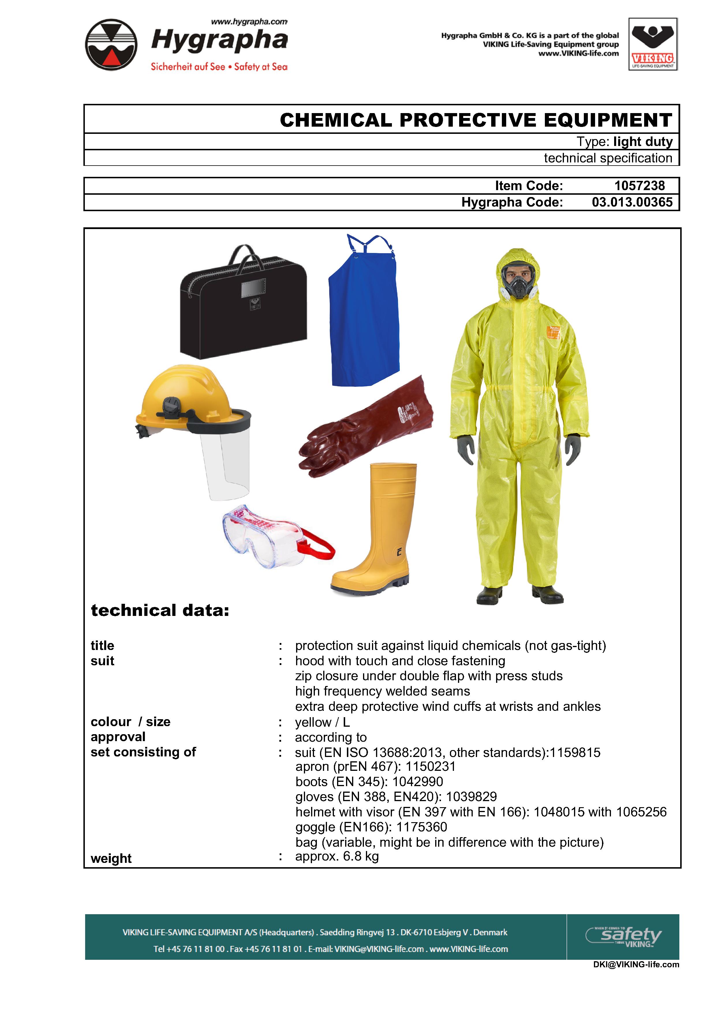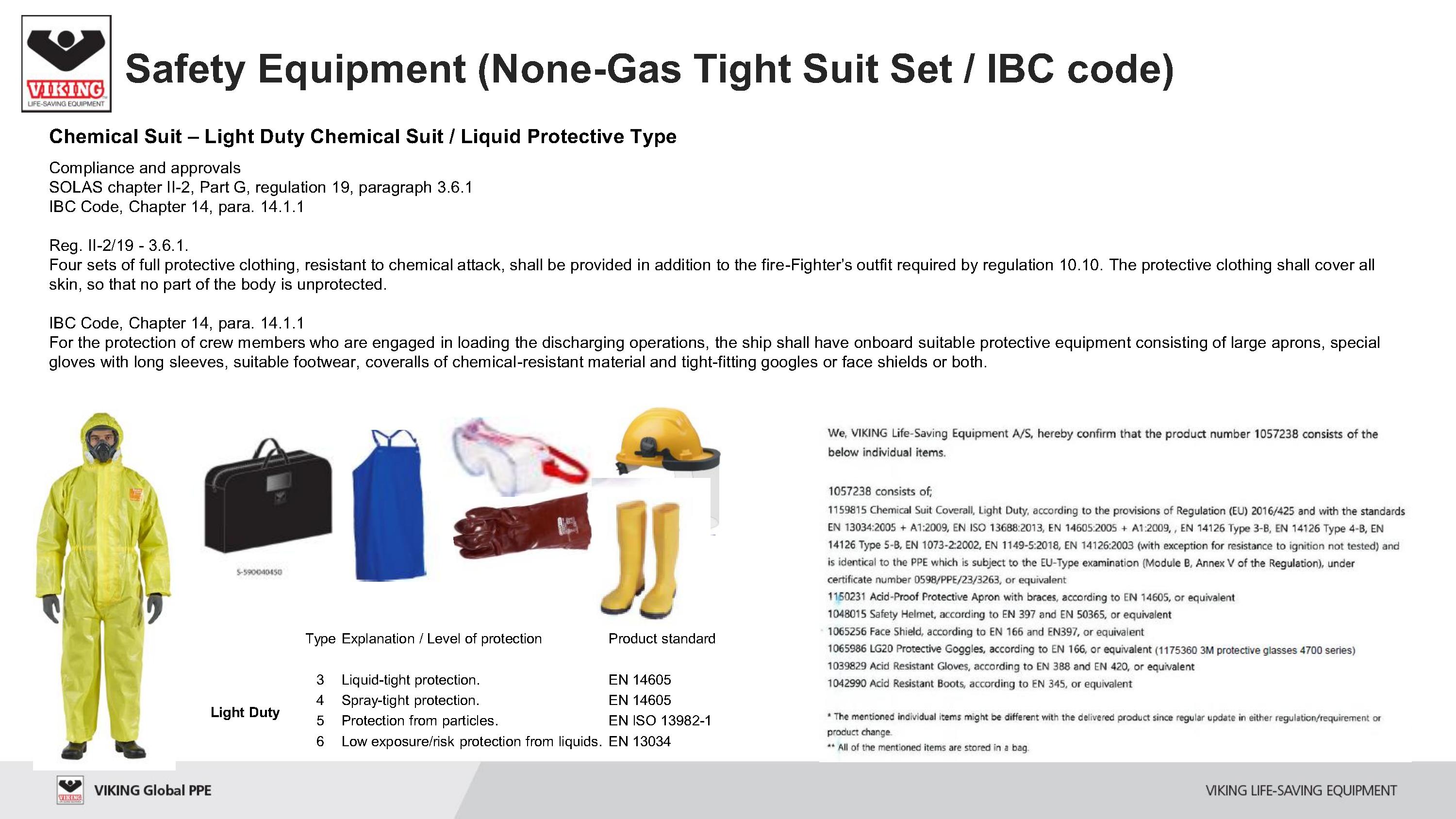 선박 및 다양한 산업 현장에서 노출될 수 있는 화학물질(gas류 제외) 및 오염물질 취급시 착용해야 하는 간이 화학복세트는 SOLAS IBC code에 의거하여 구성 품목이 지정되어 있습니다.