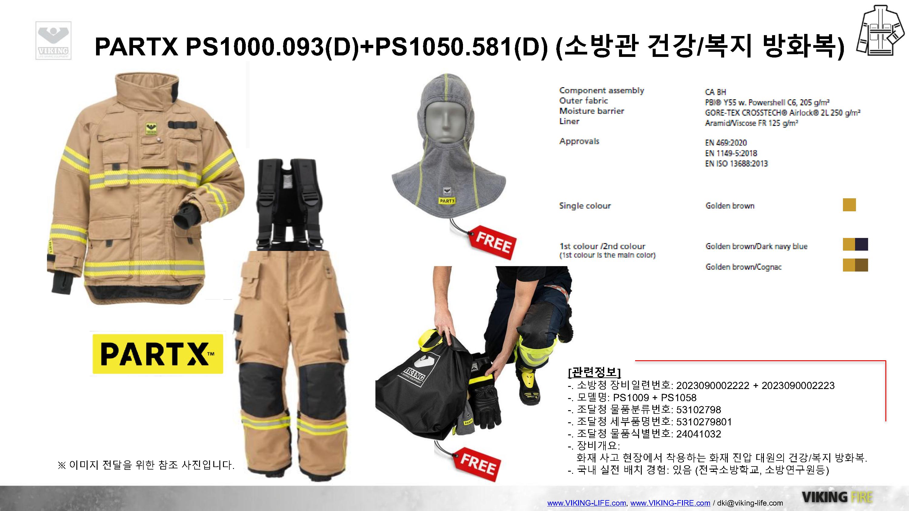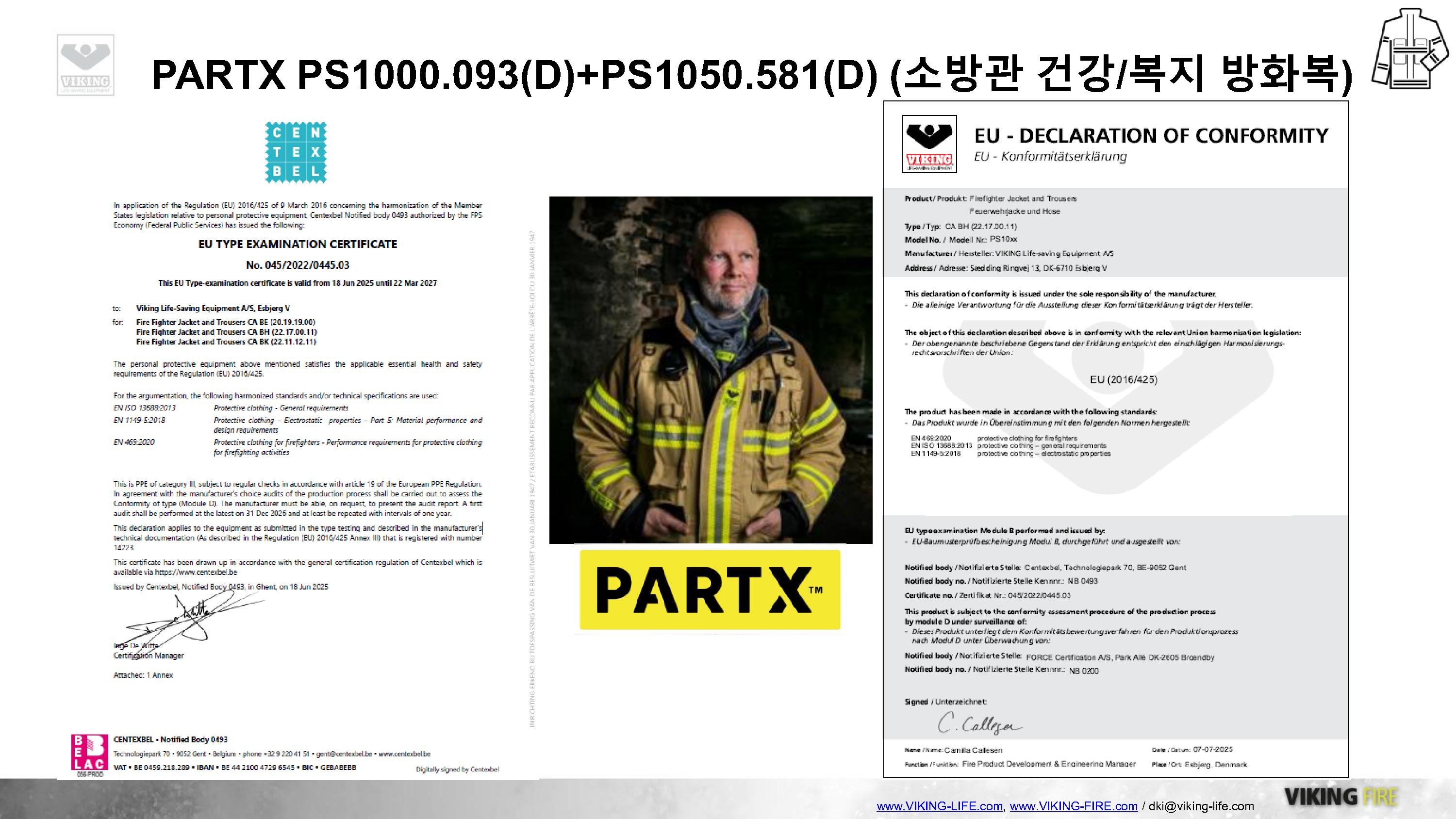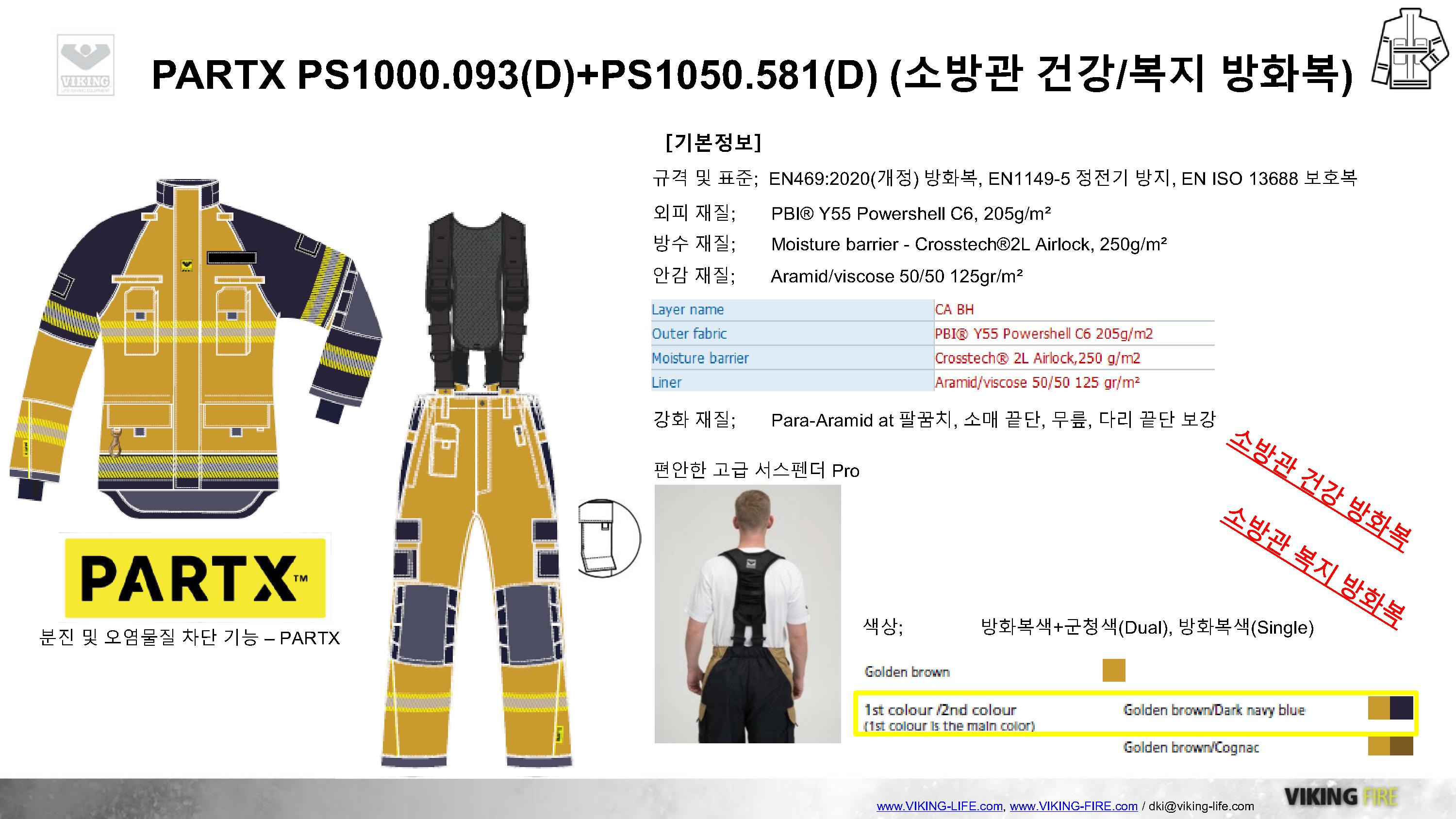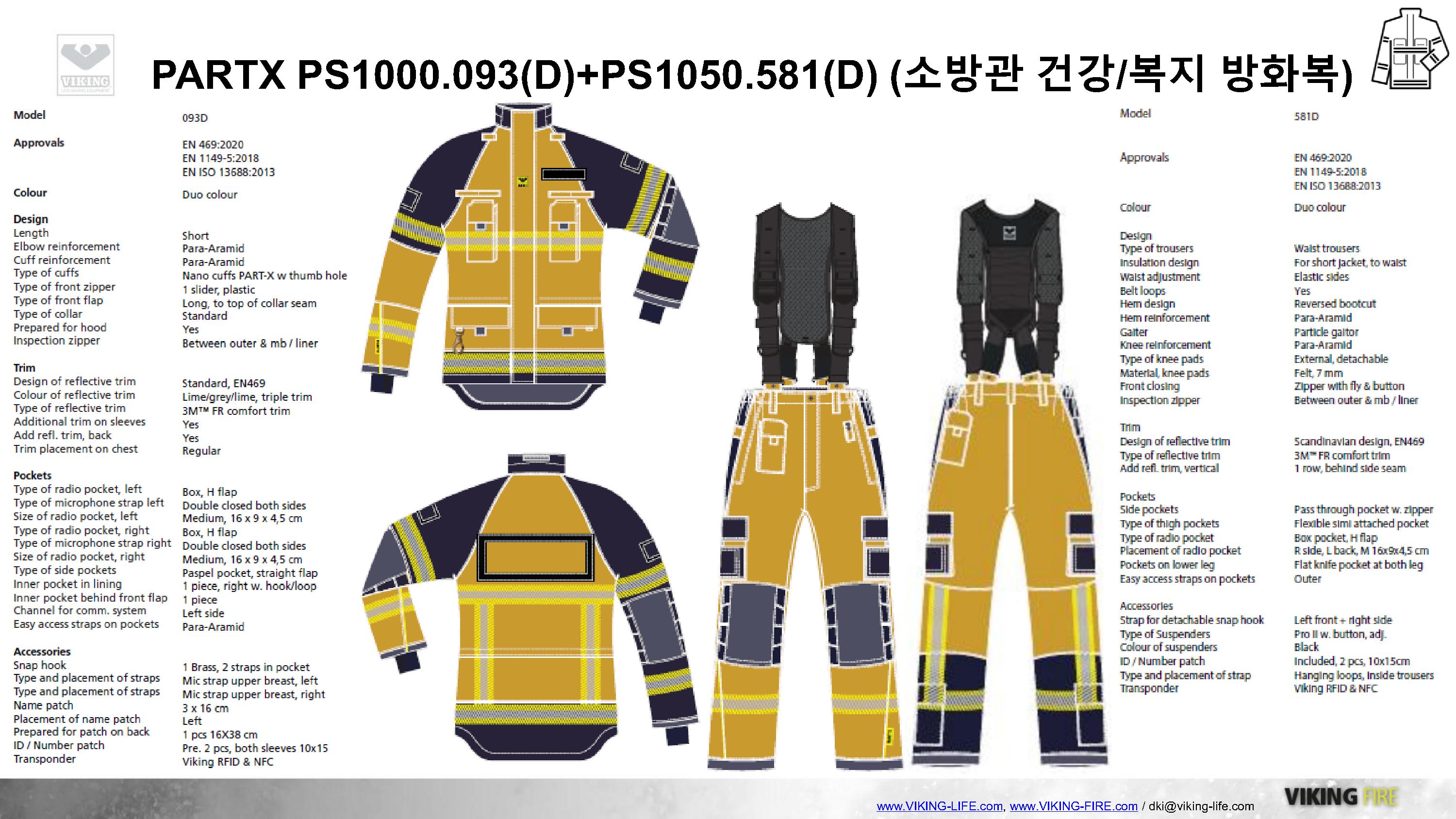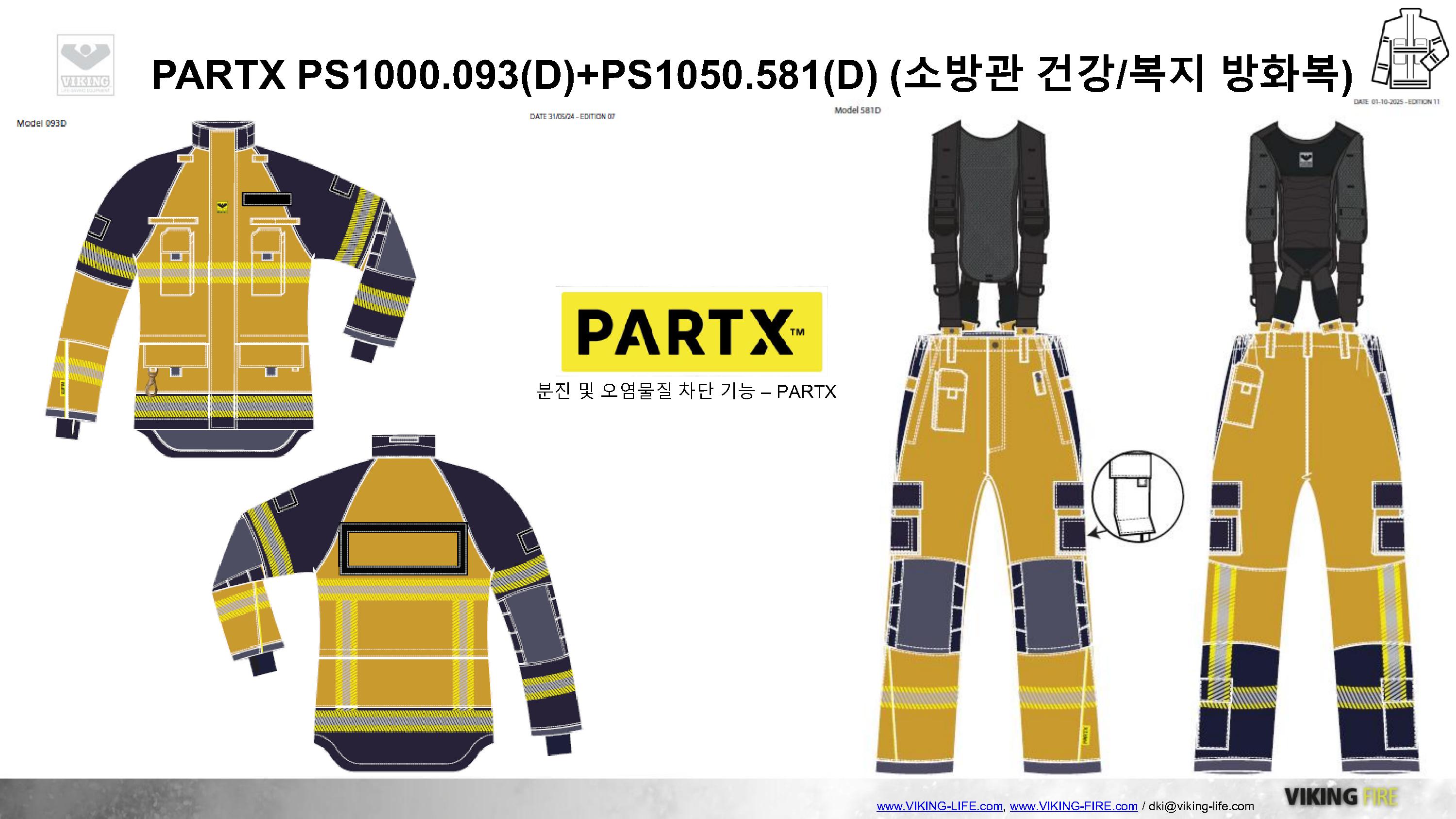 기존에 운영되던 PS1008+PS1058 파트엑스 방화복이 PS1000.093(D)+PS1050.581(D) 파트엑스 방화복 모델로 대체되어 적용되고 있으며, 국내 소방 현장에는 2026년부터 적용이 되고 있습니다.