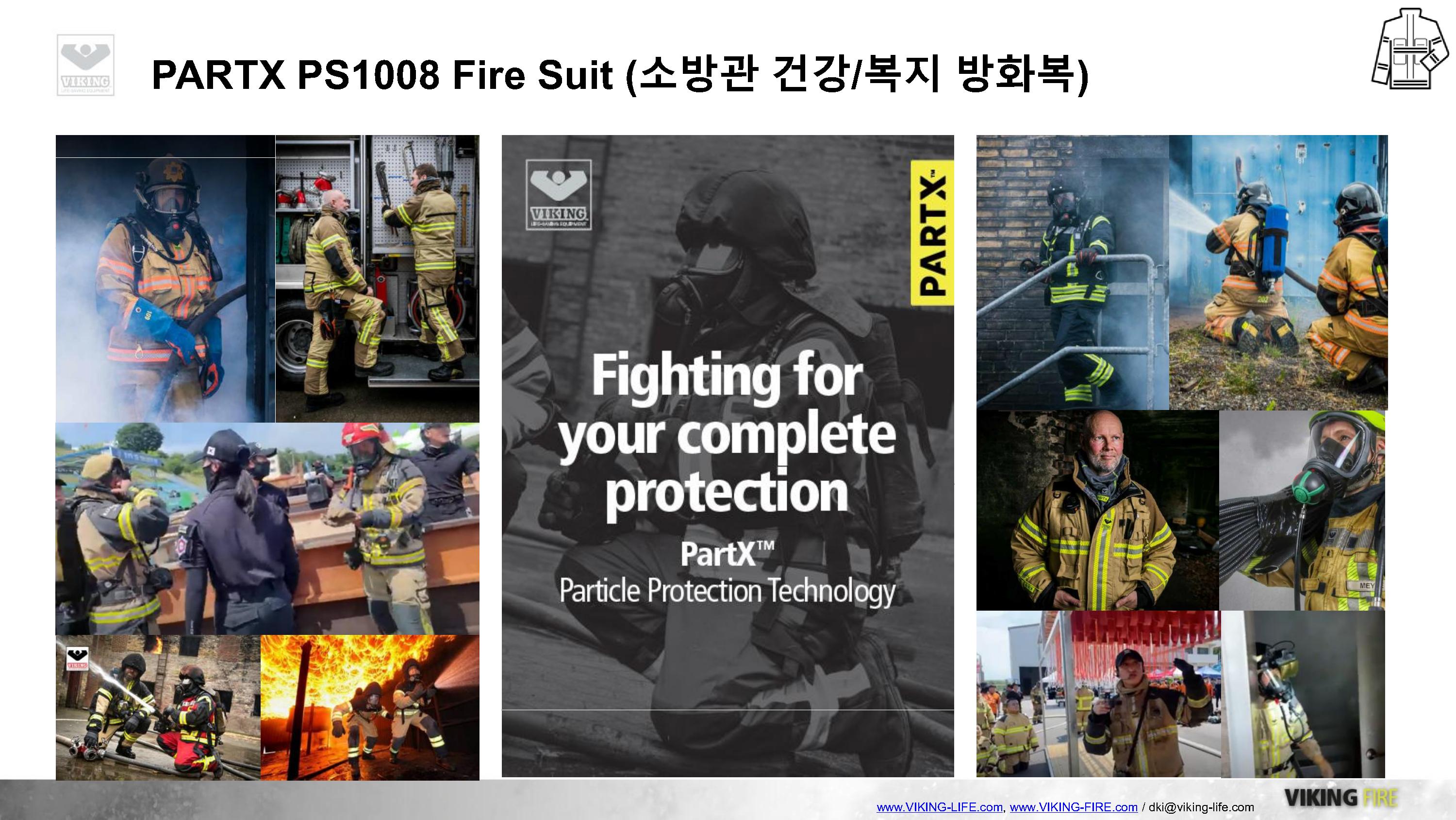 대한민국 소방산업의 대표적인 특수목적방화복인 바이킹 파트엑스방화복은 국내 소방학교 화재진압교관분들과 CFBT 전문가들, RIT 신속동료구조팀 및 특수목적 운영 대원들에 선택 받아 현장에 운영되고 있는 모델입니다.