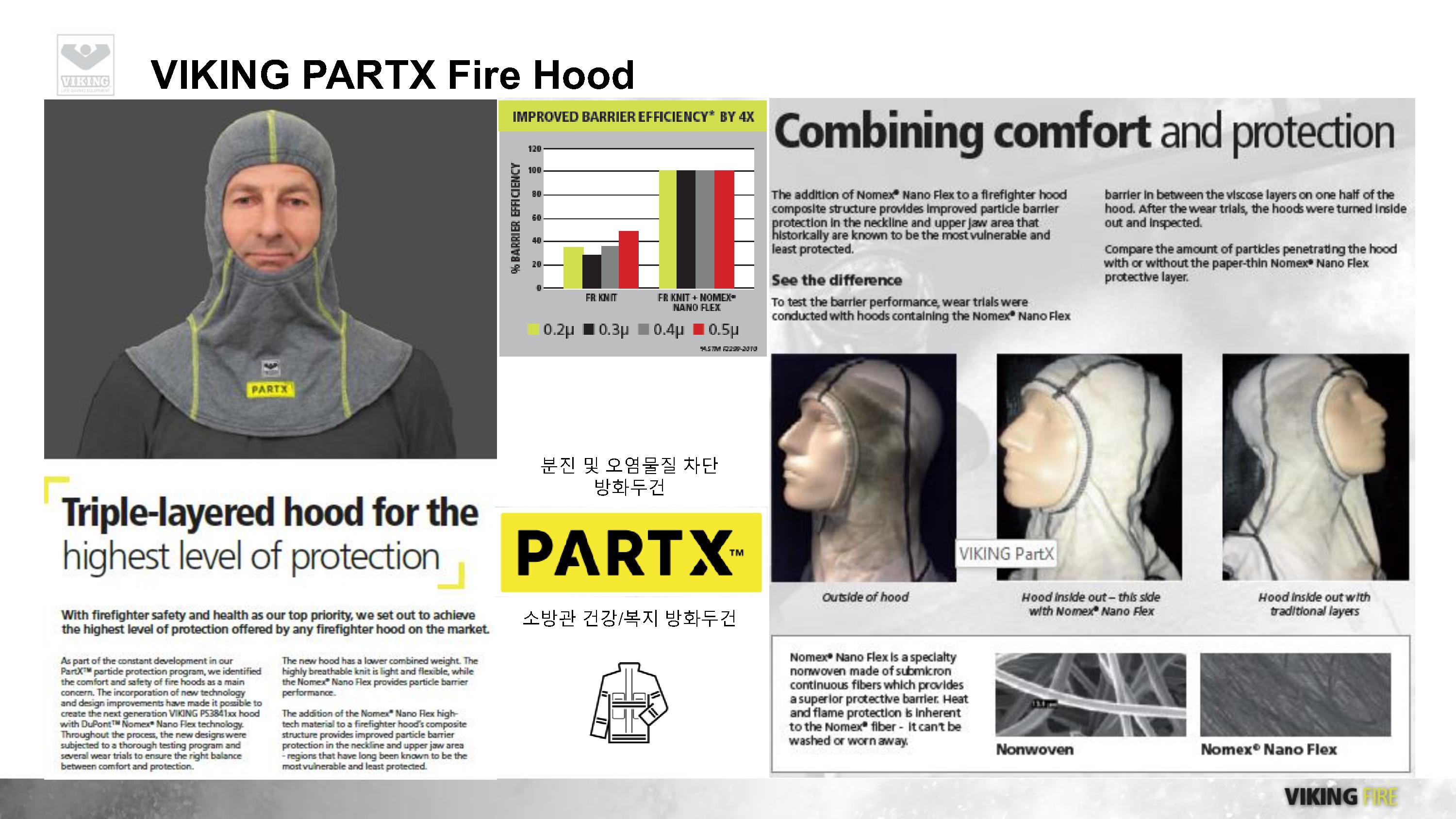 'PS1000 .093(D)+PS1050.581(D) 파트엑스 방화복 + VIKING 파트엑스 방화두건 + VIKING 파트엑스 전용(세탁)가방'은 소방관 화재진압/CFBT/RIT등의 특수 목적 대원들의 건강과 복지를 완벽하게 지원하는 개인보호장비 구성입니다.
