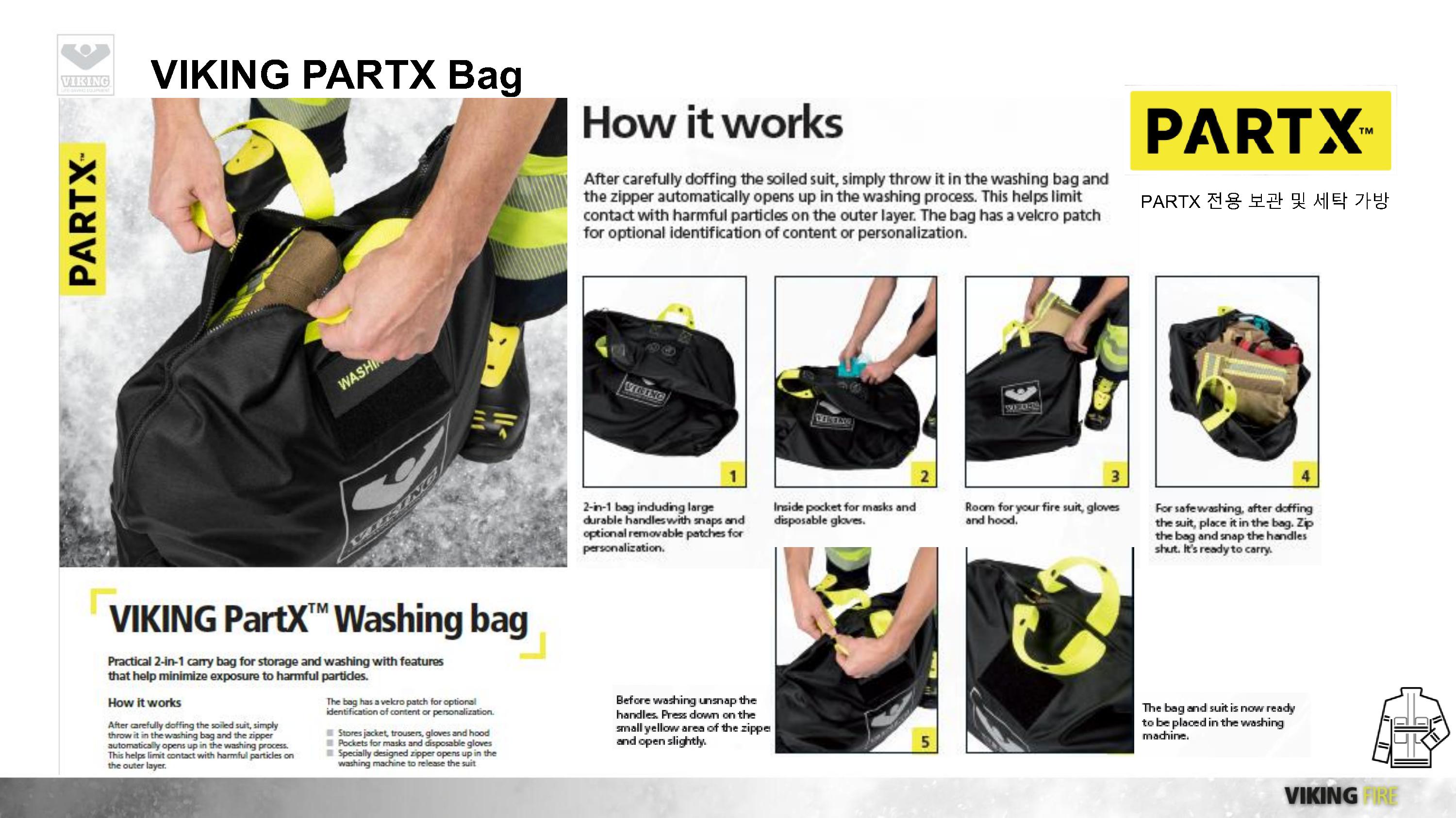 -. 완벽한 파트엑스(PartX) 컨셉 제공을 위하여, 방화복에 파트엑스방화두건과 파트엑스가방이 함께 공급됩니다.