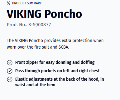 화재진압교관, 화재진압훈련, CFBT, RIT와 같은 화염에 직접 노출될 수 있는 현장에서 대원의 개인보호장비들을 추가적으로 보호할 수 있도록 걸쳐 입을 수 있는 바이킹 판초 S-5900877 VIKING Poncho가 있습니다.