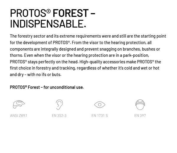 프로토스헬멧은 극한의 환경 조건을 요구하는 임업/산림 및 특수 상황을 위하여 개발이 되었으며, 지금도 그 정신을 이어가고 있습니다.