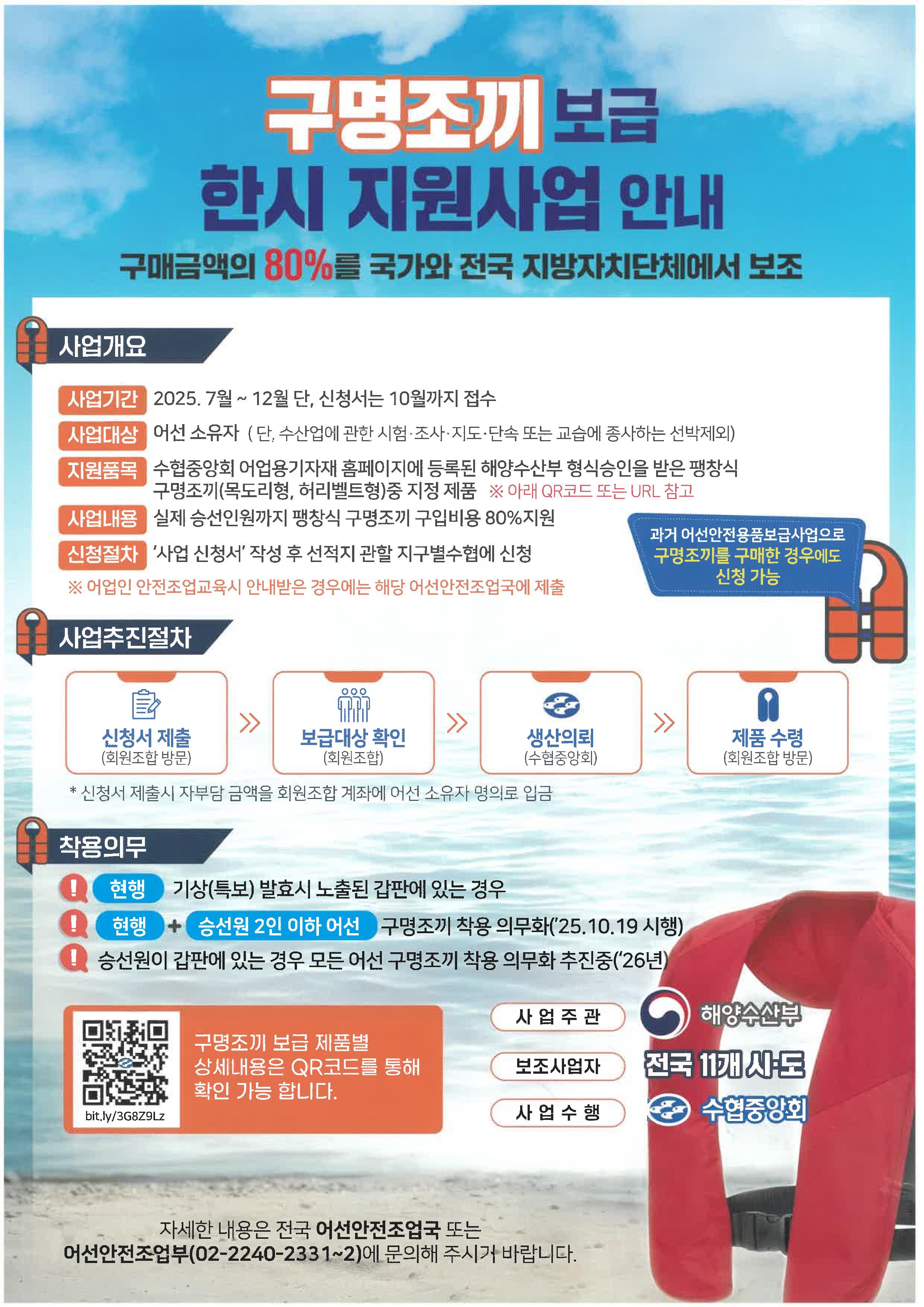 구명조끼 보급 확대를 위하여 구매 금액의 80%를 국가와 전국 지방자치단체에서 보조하여, 어선소유자에 한하여 일정기간 동안 또는 캠페인 기간을 통하여 지원하는 사업이 수협중앙회 어업용기자재를 통해서 진행되었으며, 지속적으로 확대 예정입니다.